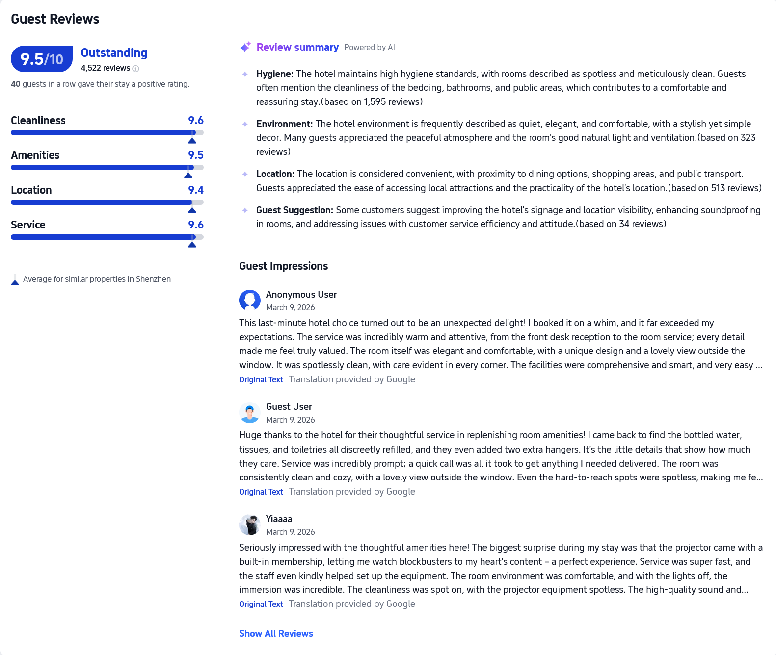 体验热情周到、处处超越期待的贴心服务。敬业的员工热情友好,随时准备迅速响应您的任何需求。便利设施包括免费停车、家庭儿童看护服务以及休闲野餐区。入住时间为下午 2 点,退房时间为中午 12 点前,确保您顺利抵达和离开。虽然酒店不提供机场接送服务,但其优越的罗湖地理位置让您轻松前往地铁站、购物中心和深圳各大景点。酒店的各项服务均体现了数千位满意宾客给予的 9.7/10 的高分评价。.