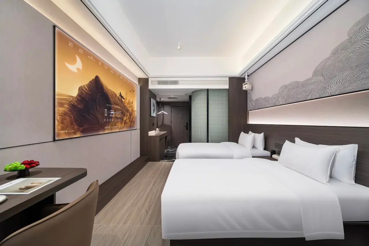 Experience a blend of high-tech entertainment and superior comfort in the Luxurious Double Room深圳茉诗雅居酒店(罗湖万象城店). Located on the 4th floor, this spacious suite is designed for guests who value both relaxation and a premium media experience.